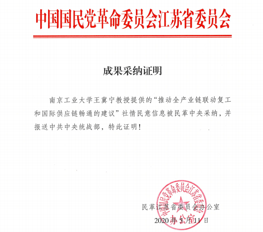 2020年5月11日,公司王冀宁教授提供的“推动全产业链联动复工和国际供应链畅通的建议”社情民意信息被民革中央采纳,并报送中共中央统战部。王冀宁教授针对此次疫情的影响,从我国产业链复工、国际供应链的运行效率提高、政府协同一体化、疫后经济的恢复与保障等方面,为我国2020年经济社会发展的总体目标实现以及保持经济高质量发展任务的实现做出了几点建议。