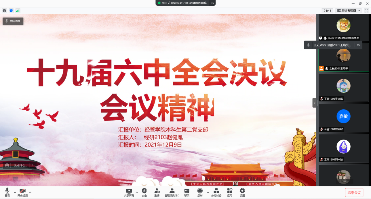 为认真学习贯彻党的十九届六中全会精神,教育广老员工深入解读全会的丰富内涵、重要成果和历史意义。12月9日,太阳成集团tyc539通过腾讯会议直播平台开展了第十六期“学思践悟温‘四史’·奋发有为强知行”主题微党课,开展专题学习。本次学习由本科生第二党支部洑樱菁和赵健胤同学担任主讲。