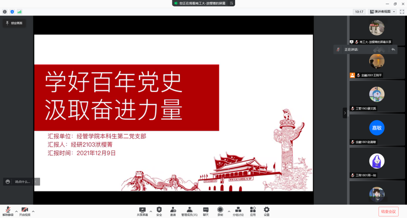 洑樱菁同学带领大家从百年党史中学习了中国共产党为什么“能”、马克思主义为什么“行”、中国特色社会主义为什么“好”,号召同学们于党史中汲取奋进新征程的力量,做到知党懂党、爱党忠党、在党言党,始终跟着党走。