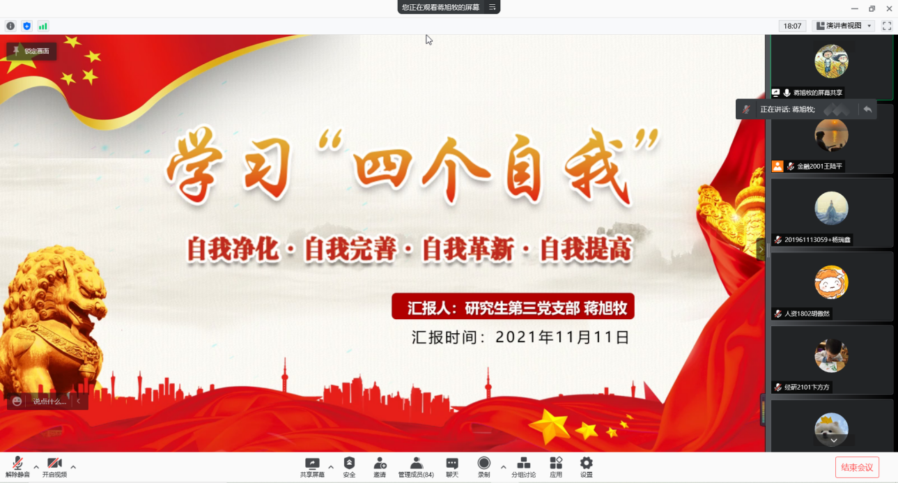 学党史、守初心、担使命。蒋旭牧同学与大家一同学习“自我净化、自我完善、自我革新、自我提高”的革命思想,感悟中国共产党人的初心使命,激励全体党员要牢牢把握“四个自我”,在学思践悟中练好本领,积极投身到第二个百年奋斗目标的奋斗征程中。