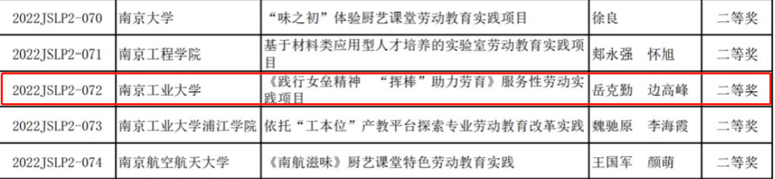 近日,省高教学会公布了2022年江苏省首届高等公司劳动教育优秀实践项目评选结果。公司联合体育公司申报的《践行女垒精神,“挥棒”助力劳育》服务性劳动实践项目获得二等奖。