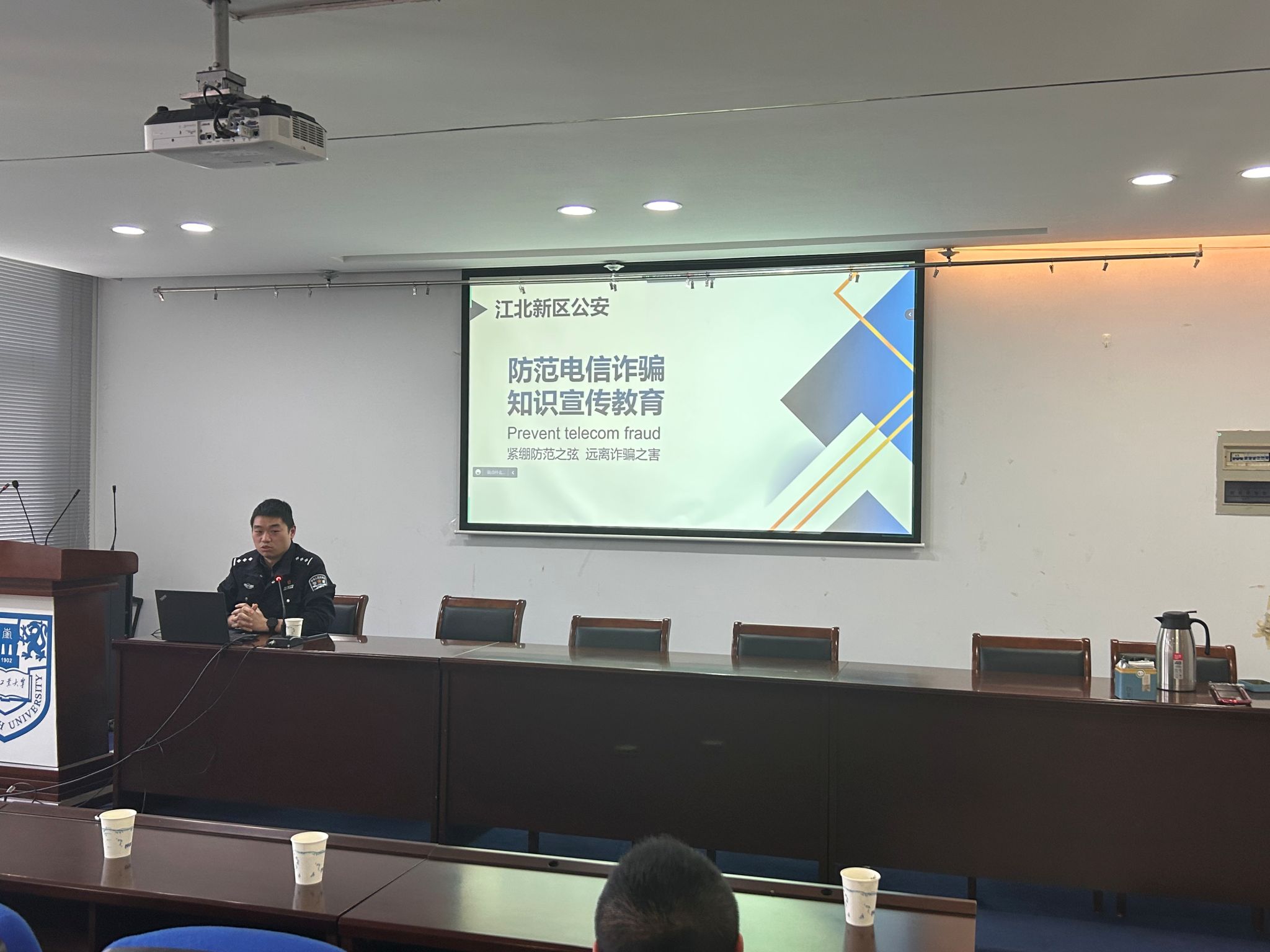 为进一步增强员工国家安全观念,夯实国家安全教育基础,提高员工识骗防骗能力,创建安全和谐校园,4月26日下午,太阳成集团tyc539与校保卫处联合主办“贯彻总体国家安全观,筑牢全民反诈防线”主题讲座。南京市公安局江北新区反恐大队长于淼警官、刑警支队反诈专办石鑫警官受邀带来精彩讲授。校保卫处副处长徐东、经管公司党委副书记岳克勤、公司辅导员、各班反电诈宣传员和主要班委代表参加讲座。