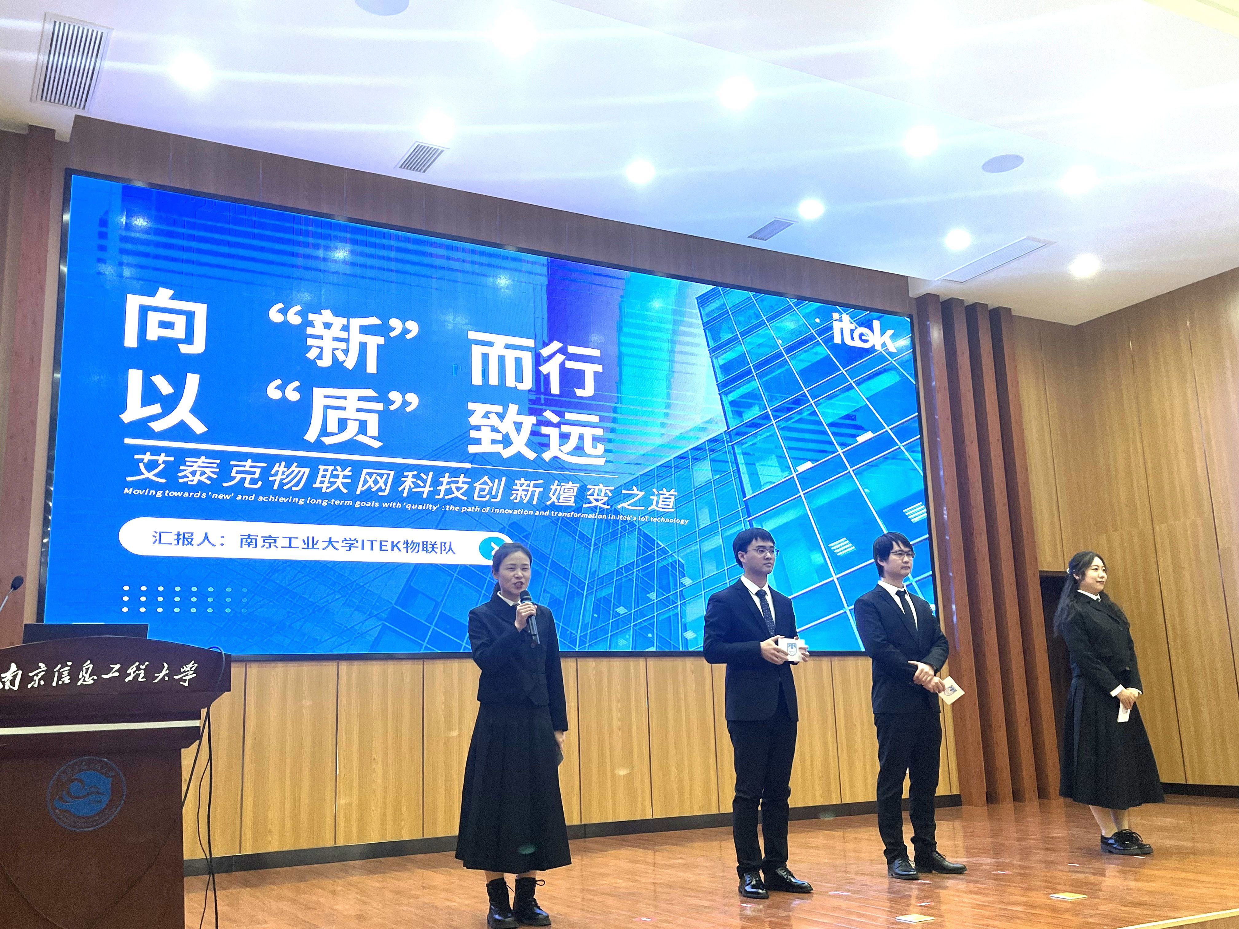 大赛从10月初拉开帷幕,为圆满完成参赛任务,公司领导高度重视并给予大力支持,公司组建了一支由金鑫、芈天、邱海龙、李静、杨祥、杨朝迪、周渝晖、董亚东八位工商管理专业研究生参赛,李宏贵、张家峰两位导师指导的队伍。团队成员经过企业调研,讨论切磋,撰写修改等环节,以《向“新”而行 以“质”致远 艾泰克物联网科技创新嬗变之道》为案例文本,顺利通过盲审,进军决赛。在决赛现场PK环节,四名选手以饱满的斗志、敏锐的才思和稳健的台风,通过对南京艾泰克物联网科技有限公司的深入研究和精准分析,为企业赋能新质生产力高质量创新发展提出了有效可行的解决方案和策略。公司团队赢得评委会高度评价,结合案例文本盲评第二,最终获得一等奖。同时,公司另一支由魏永涛、蒋轶群、蔡烨、刘淇悦、李双、侯鹏举、丁婉翌、刘卿超、郑庆玲九位工商管理专业研究生组成,张长江、夏后学两位导师指导的参赛团队荣获三等奖。