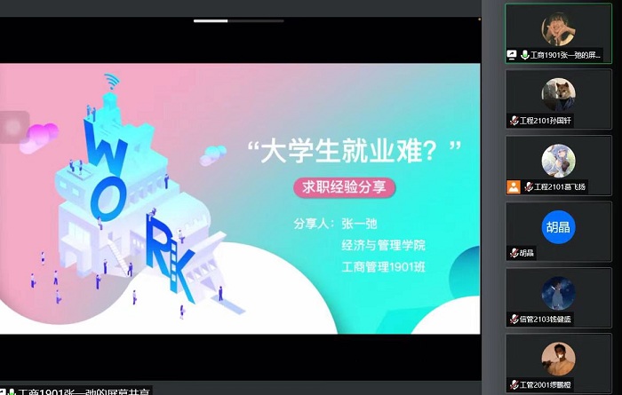 信管2103钱健盛围绕学习主题展开交流,提出老员工需合理分配学习和娱乐的时间,学会制定学习计划。会计2002刘漪宁结合自身经验详细地介绍社会工作,鼓励同学们敢于取舍、积极参与。工管2001缪鹏橙在员工工作、双创比赛和学科竞赛方面提出了针对性建议。工商1901张一弛通过讲述自己的实习经历,分享求职就业的经验,为同学们做职业规划打好基础。实用的经验分享,引起了新生的共鸣,随后,新生们与学长学姐进行了深入地互动和交流。