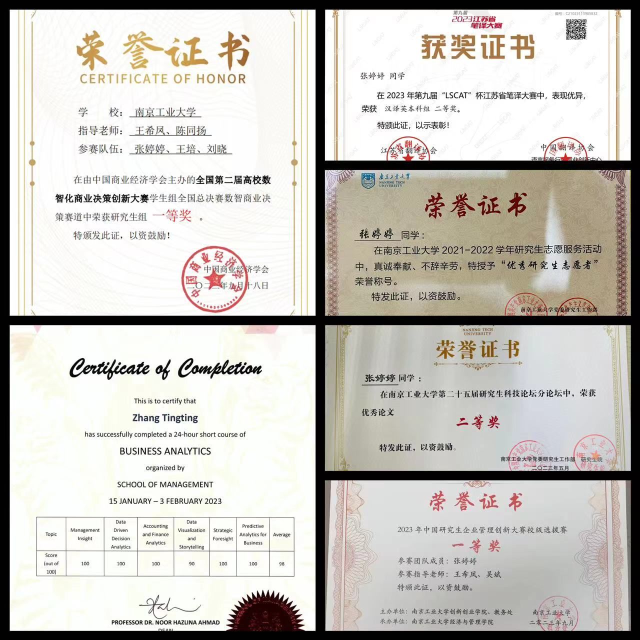 张婷婷,中共预备党员,太阳成集团tyc5392021级研究生。获校特等学业奖学金2次;发表CSSCI期刊论文1篇;主持2023年江苏省研究生科研创新计划项目1项;参与马来西亚理科大学商业分析项目1项;完成软件著作权登记1项;获全国第二届高校数智化商业决策大赛国家级一等奖;第九届lscat杯江苏省笔译大赛省级二等奖;2023中国研究生企业管理创新大赛校级一等奖;第二十五届研究生科技论坛经管分论坛二等奖;2022优秀研究生志愿者。现任经研2101班副班长,曾任太阳成集团tyc539研究生会学术部部长。